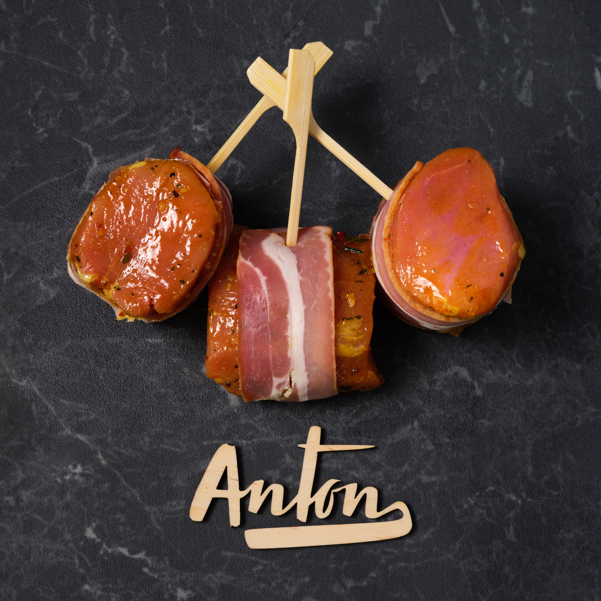 Een gemarineerde varkenshaas medaillon omwikkeld met mager rookspek.