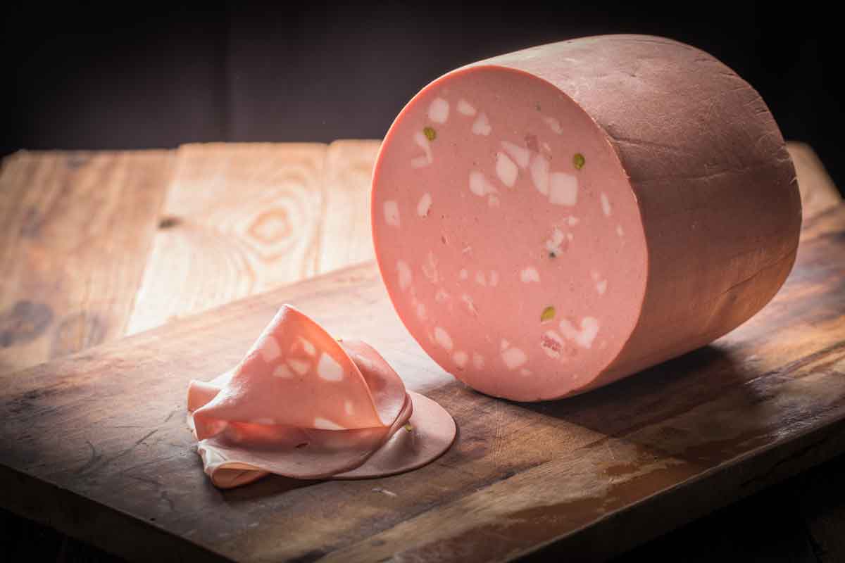 Mortadella komt uit Italië. Een verfijnde smaak met pistachenoten. Lekker op een broodje, op de borrelplank of door een salade.