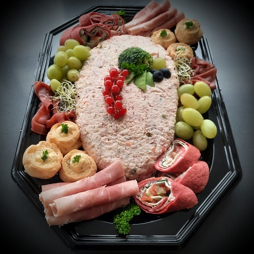 Een 4 persoons opgemaakte salade op basis van rundvlees, rijkelijk gegarneerd met luxe vleeswaren en hapjes.